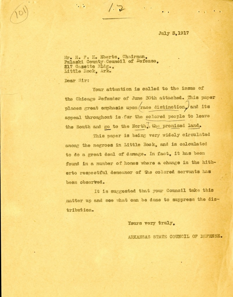 Correspondence to H.F.H. Eberts from the Arkansas Council of Defense, 1917 July 3