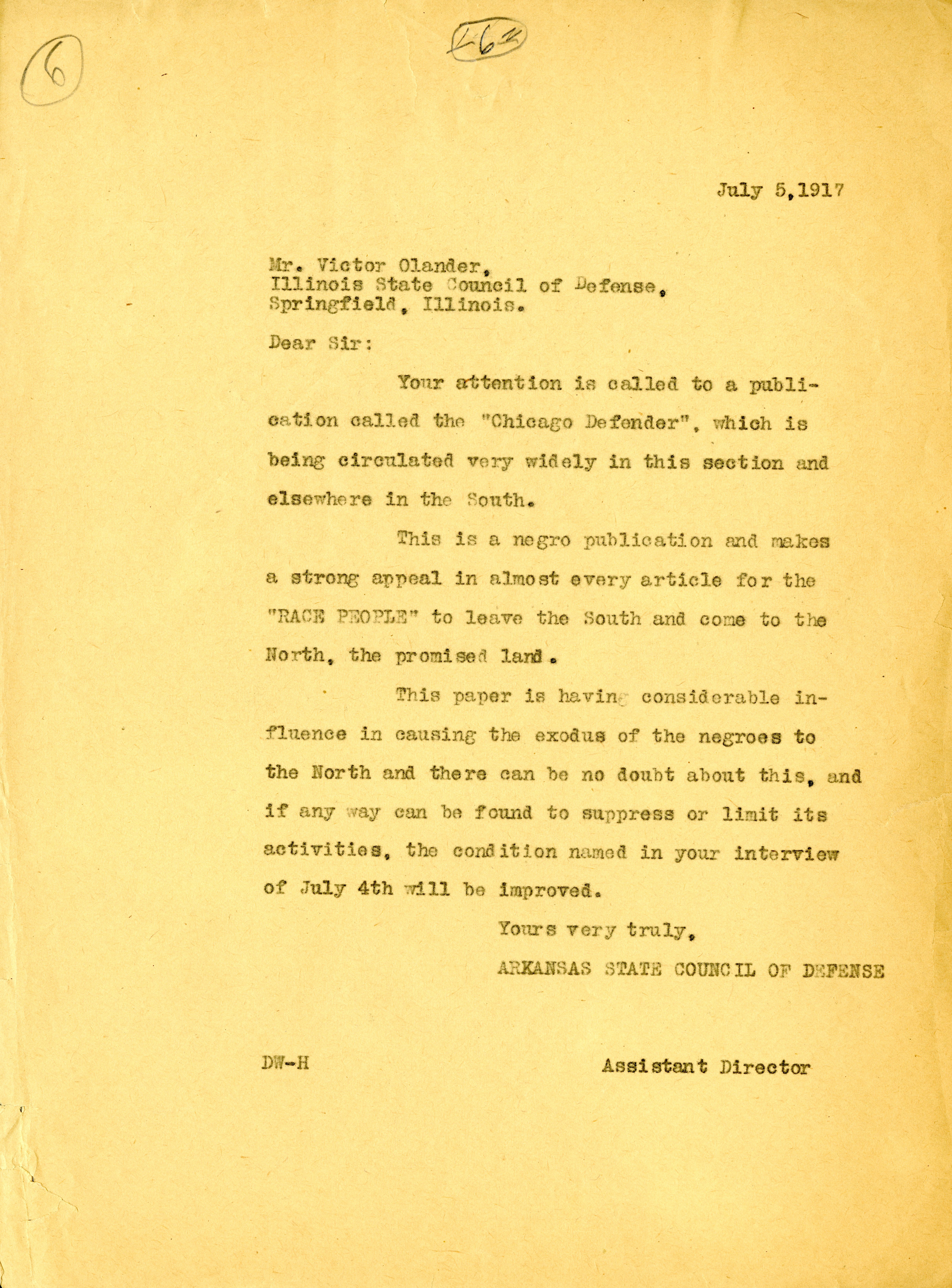 Correspondence to Victor Olander, Illinois State Council of Defense, 1917 July 5