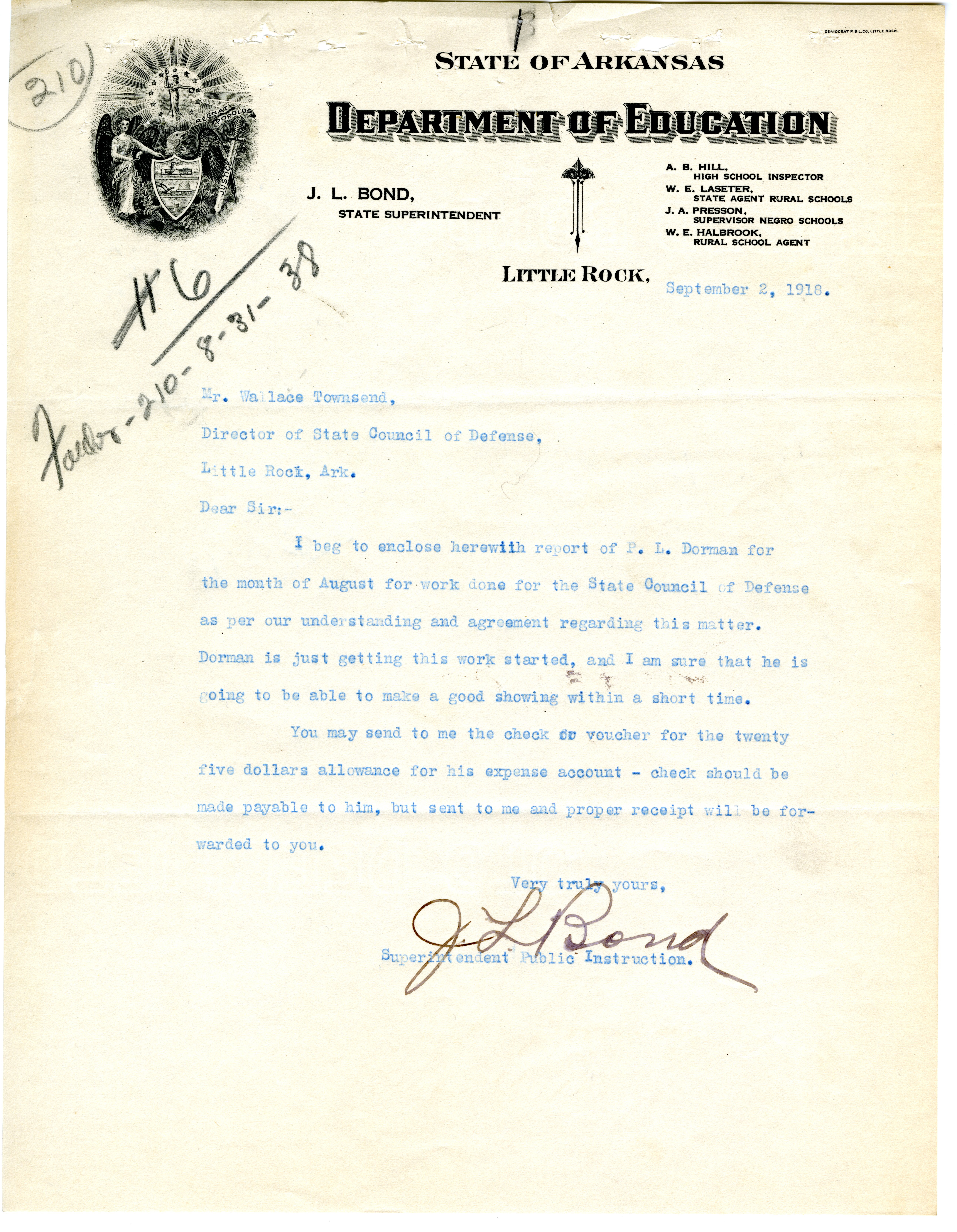 Correspondence from Judge G.B. Ewing to Arkansas State Council of Defense, 1918 October 23
