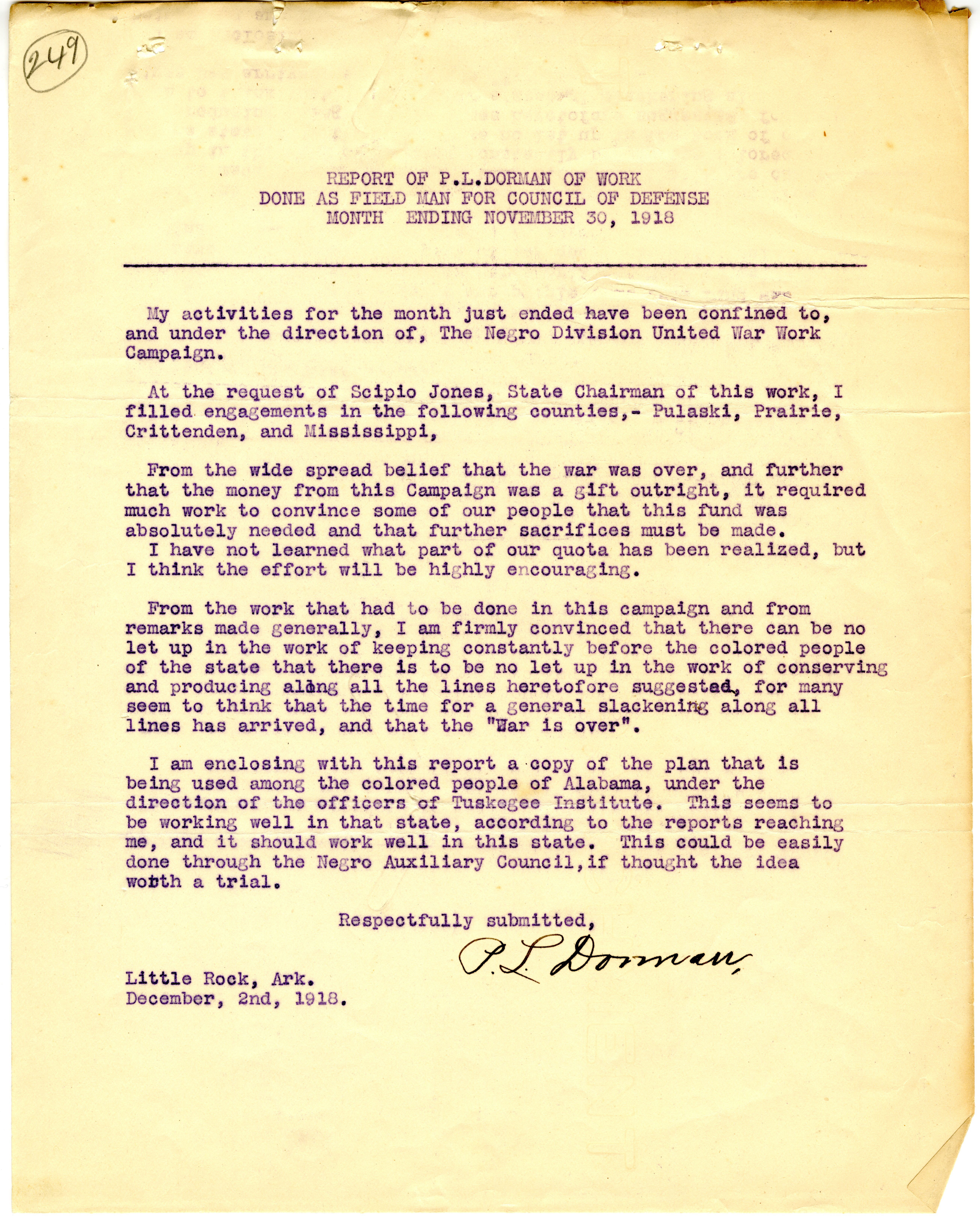 Correspondence from Judge G.B. Ewing to Arkansas State Council of Defense, 1918 October 23