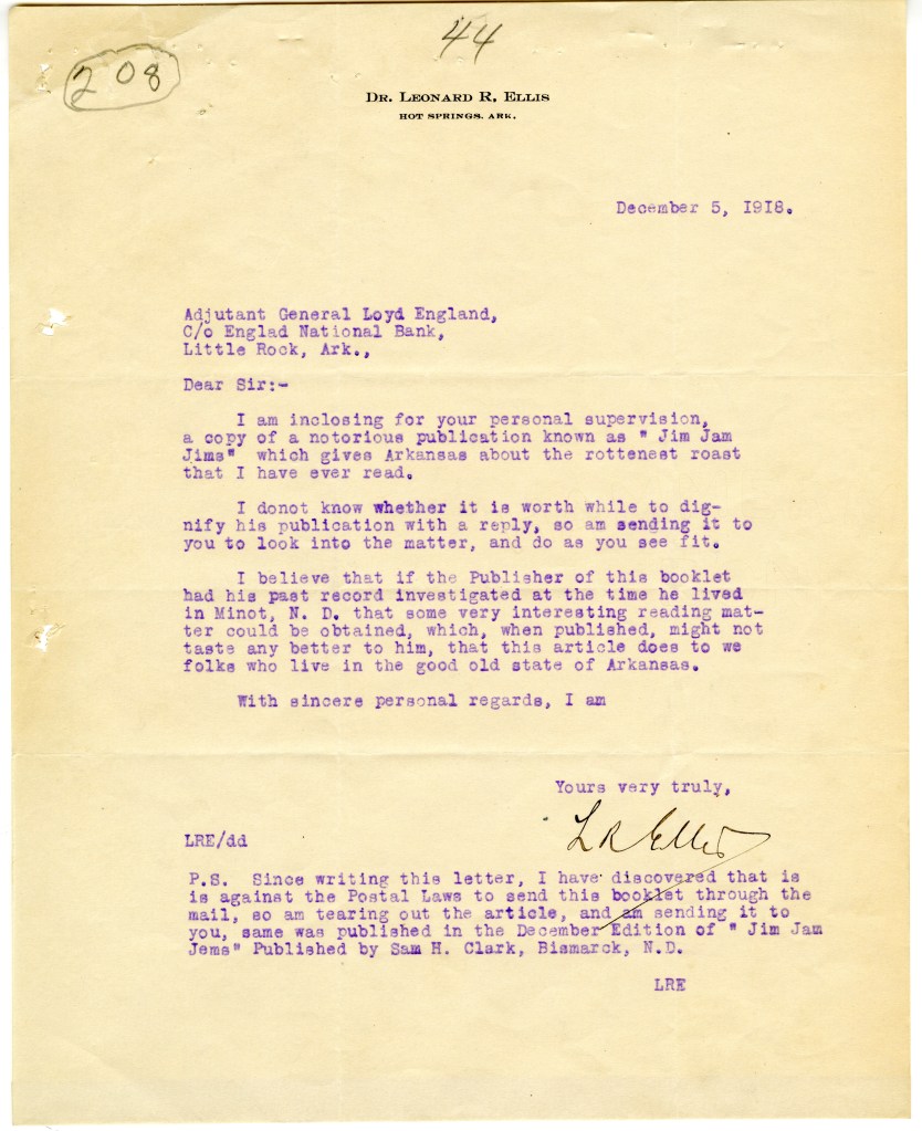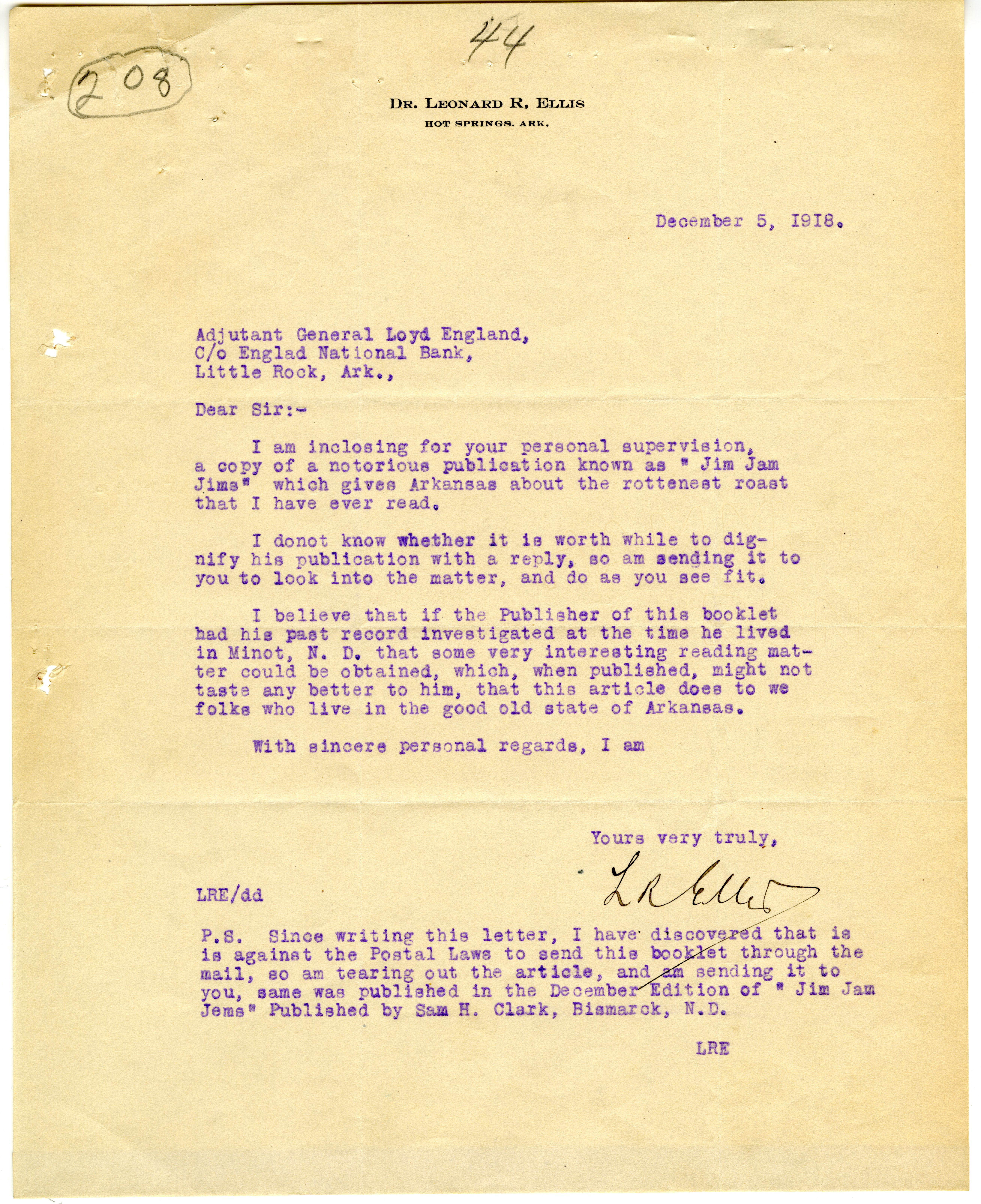 Correspondence from Judge G.B. Ewing to Arkansas State Council of Defense, 1918 October 23